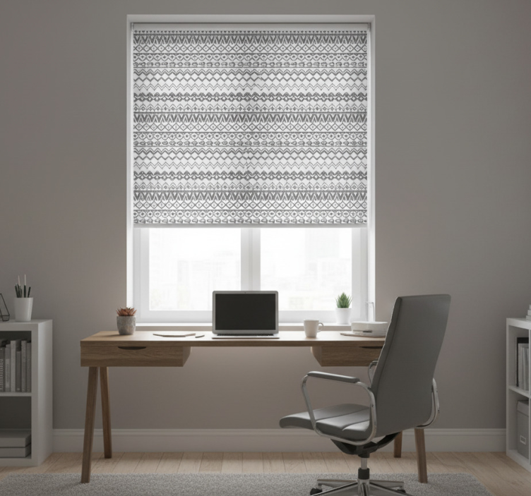 Reference: E7867Introducing our stunning Black roller blind with hand-drawn tribal design that radiates creativity and artistry! The intricate tribal patterns beautifully blend bold black hues with captivating designs, making it a perfect statement piece for any room. This roller blind not only enhances the aesthetic appeal of your space but also offers practical benefits such as easy assembly, easy cleaning, and effective light regulation. With customizable options available, you can choose the texture that best suits your needs for light and privacy!