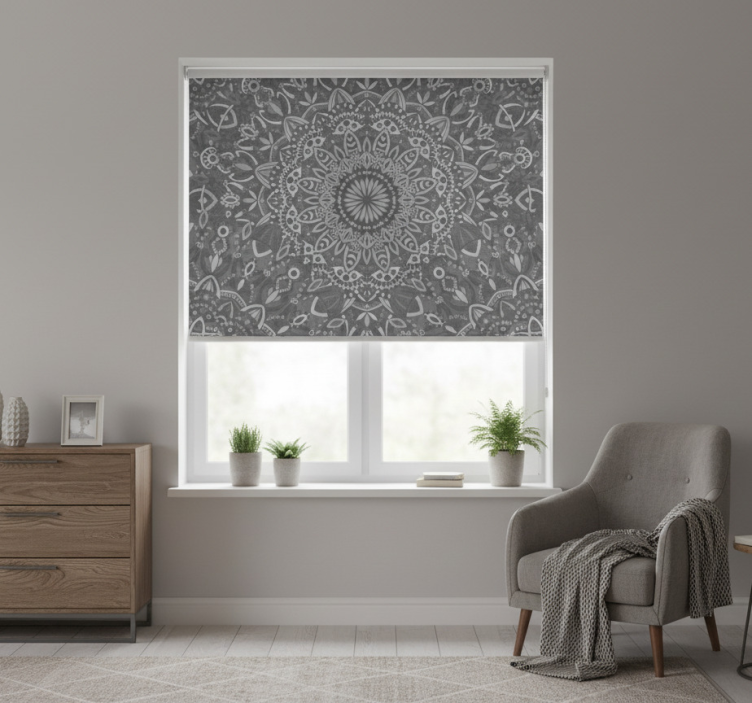 Reference: E8803Introducing our stunning Blind grey intricate mandala design, a captivating piece that beautifully combines artistry and functionality. This design features an elegant grey color palette, showcasing intricate mandala patterns that are not only visually striking but also create a serene ambiance in any space. The roller blind is crafted for easy assembly in just 2 clicks, is easy to clean, and offers quick disassembly to keep your windows and surroundings pristine. With its ability to protect your room from direct sunlight while providing privacy and temperature regulation, this roller blind is the perfect addition to enhance your home decor!