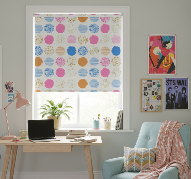 The Blind teens colorful dot pattern blind teens is more than just a window covering; it's a statement piece! This fun and colorful design can transform any space into a lively retreat, inspiring creativity and happiness. Whether it's for a bedroom, playroom, or study area, this roller blind enhances the decor while providing essential functionality. Let your personality shine through your choice of window treatments!