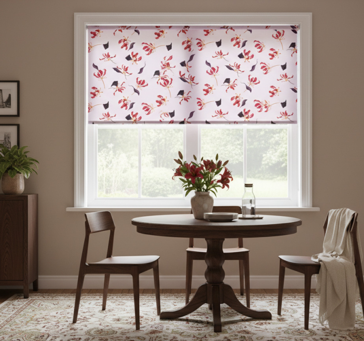 Dining room blind with hand-drawn red lily design
