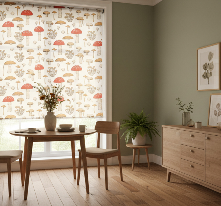 Dining room blind with yellow and red mushrooms flowers