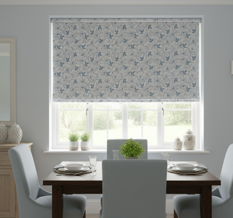 Transform your dining space with our exquisite Floral blue hamptons pattern dining room blind. This stunning design features a harmonious blend of elegant floral motifs in soothing blue tones, creating a serene and inviting atmosphere. With its easy assembly and disassembly in just two clicks, this blind not only enhances your room's aesthetic but also simplifies your cleaning routine. The ability to regulate room temperature, provide privacy, and protect against direct sunlight makes this roller blind a versatile addition to any home.