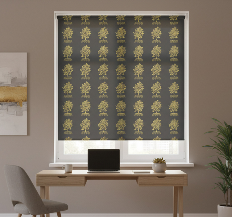 Reference: E6213Introducing our stunning Golden trees outline home office blind, a beautifully designed piece that seamlessly blends elegance with functionality. This roller blind features a captivating golden tree outline that brings a touch of nature indoors, enhancing your home office with a sense of serenity and inspiration. The intricate design not only adds visual interest but also provides essential benefits, such as protecting your space from direct sunlight, ensuring your privacy, and allowing you to regulate the room temperature effectively.