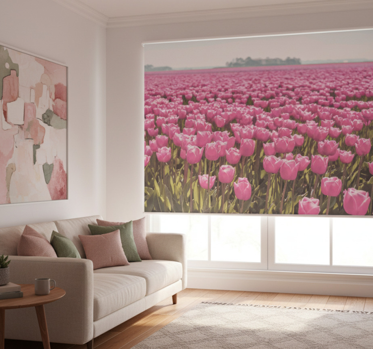 The Living room blind in a field of pink tulips living room blind is a perfect choice for anyone looking to elevate their home décor. Its vibrant floral design adds a splash of color and charm to any room, making it a delightful focal point. This roller blind not only beautifies your space but also provides privacy and regulates light, ensuring your living area remains comfortable and stylish. With such an inspiring look, it’s no wonder this blind is a must-have for your home!