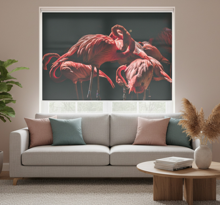 Reference: E8982Transform your living space into a tropical paradise with our Living room blind with rim-lit pink flamingos. This stunning roller blind features whimsical pink flamingos elegantly rim-lit against a vibrant backdrop, adding a playful yet sophisticated touch to your home decor. The design seamlessly combines functionality with aesthetics, making it a perfect addition for those looking to enhance their living room ambiance.