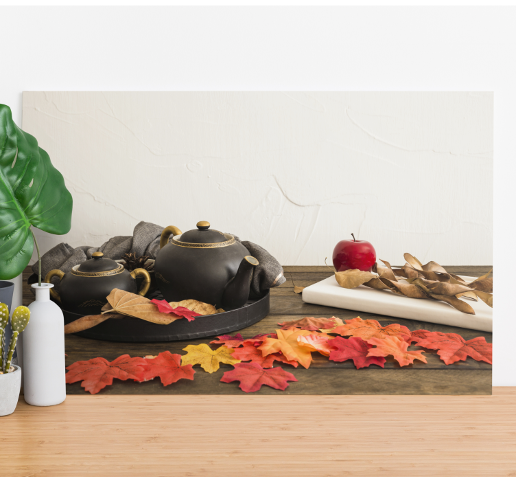 Immerse yourself in the beauty of our Autumn Tea Arrangement landscape canvas, a stunning visual representation that captures the essence of fall. This exquisite design features a charming display of teapots, a rustic table adorned with autumn leaves, and a delightful apple, all harmoniously arranged in a still life composition. The warm colors and inviting imagery create a cozy atmosphere, making it a perfect addition to any space!