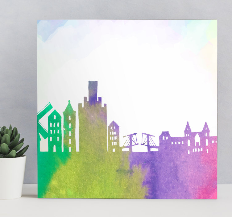 Discover the beauty of our Cityscape wall art urban silhouette skyline, featuring a stunning watercolour design that captures the essence of the Netherlands. This artistic masterpiece showcases a vibrant skyline with colorful buildings and iconic landmarks, all hand-painted to perfection. The intricate details of this painting breathe life into any space, making it a perfect addition to your home or office decor!
