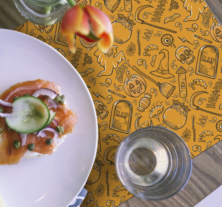 Get ready to elevate your Halloween festivities with our Halloween placemats with eerie halloween designs! These vibrant and whimsical placemats feature a captivating pattern filled with ghosts, skulls, pumpkins, spiders, and tombstones, all set against a lively orange backdrop. Perfect for any celebration, these designs will enchant your guests and create an unforgettable atmosphere!