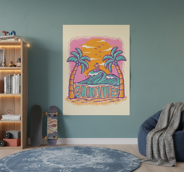 Reference: G1021Introducing our vibrant Good vibes surf poster for teenager, a stunning piece of artwork designed to uplift and inspire! This poster features a dynamic surf scene with bright colors, capturing the essence of youth and adventure. Made from 180g/m2 grammage, it has a semi-matt finish that prevents reflections, ensuring high color intensity that brings life to any room.