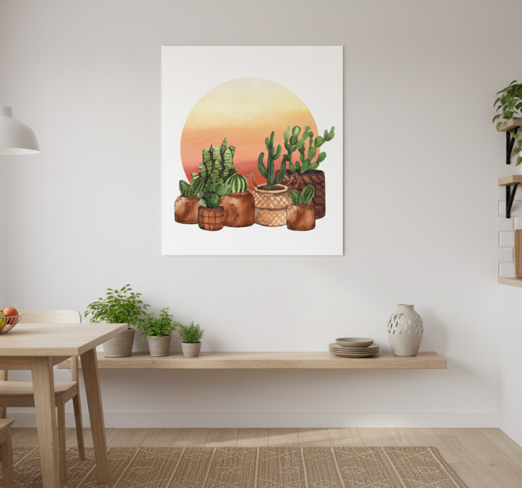 Reference: G657Introducing our stunning Kitchen poster cactus with sunset in circle, a captivating blend of vibrant colors and intricate design. This poster features a beautiful cactus silhouette framed by a breathtaking sunset, creating a serene and inviting atmosphere. The 180g/m2 grammage ensures durability, while the semi-matt finish prevents reflections, allowing the high color intensity to shine and transform your kitchen space into a warm haven of tranquility!