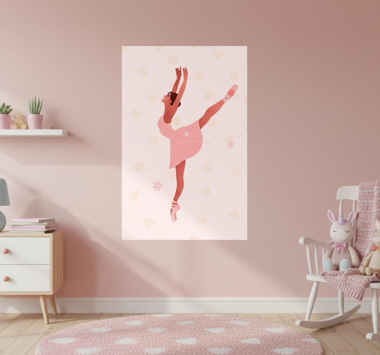 Reference: G916Bring a touch of whimsy and elegance to your child's space with our Nursery poster ballerinas with hearts. This stunning design showcases graceful ballerinas dancing amidst a flurry of hearts, creating a delightful atmosphere that inspires creativity and joy. The poster is printed on high-quality 180g/m2 paper, ensuring a semi-matt finish that highlights its vibrant colors without reflections. The high color intensity makes every detail pop, making it a perfect centerpiece for any nursery or playroom!