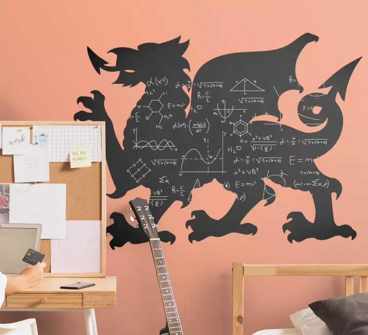 Introducing our stunning Chalkboard sticker welsh dragon silhouette, an artistic representation of the iconic Welsh emblem. This design features a beautifully stylized silhouette of the dragon, combining elements of mathematics and geometric shapes to create a captivating symbol. Perfect for adding a touch of Welsh culture and creativity to any space!