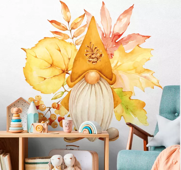 Transform your living space with our Decoration wall sticker autumn gnome design, featuring a delightful watercolour illustration that captures the essence of autumn. This charming design showcases a whimsical gnome surrounded by vibrant autumnal leaves, evoking the beauty of fall and the serenity of nature in your home. It's the perfect touch to bring warmth and joy to any room!
