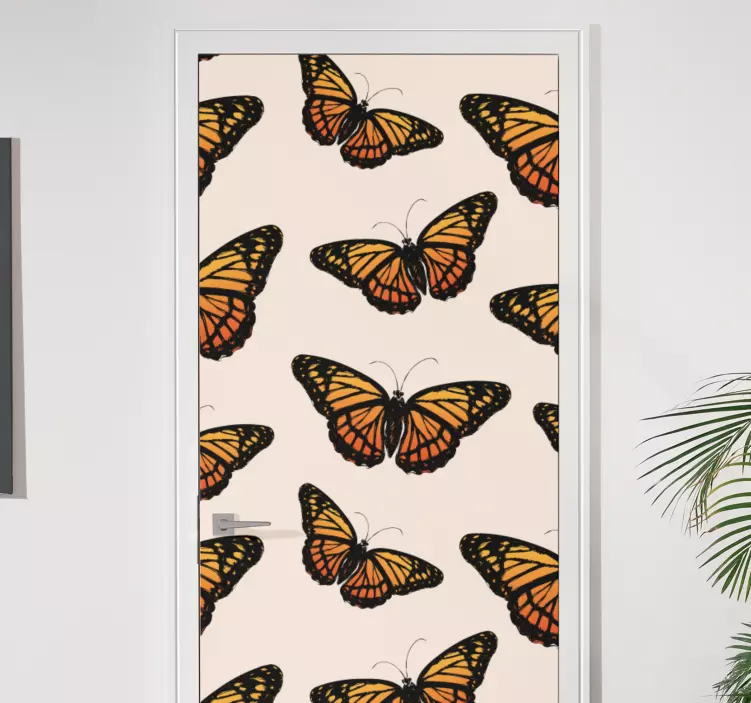 Transform your space with our Door sticker colorful butterfly illustration! This stunning design features a vibrant array of butterflies, including the beautiful monarch, set against a backdrop of nature. The lively orange hues and intricate pattern create a decorative piece that adds charm and warmth, making any door a delightful focal point.