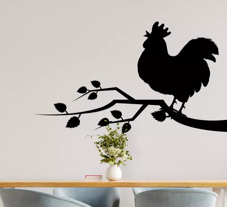 Reference: A49034A striking silhouette of a rooster perched on a branch, harmonizing elements of nature with farm life. The branch adorned with leaves adds an organic touch, enhancing the rustic feel of the design, ideal for bringing a rural charm to any space.