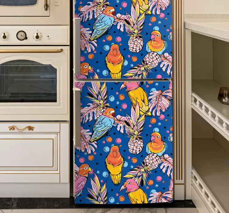 Introducing our Fridge sticker colorful parrots design, a vibrant representation of nature that instantly brings a touch of the tropics into your kitchen! This stunning design features lively parrots and playful pineapples in a colorful pattern, creating a cheerful atmosphere that radiates warmth and joy. The combination of bright colors and tropical elements makes it a perfect addition to any fridge, transforming your space into a delightful sanctuary that celebrates the beauty of nature!