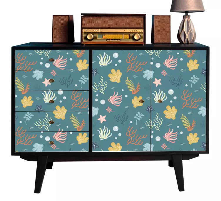 Transform your living space with our Furniture sticker coral reef design, a stunning graphical representation of underwater beauty! This vibrant design showcases a delightful array of sealife, including colorful corals, starfish, and marine plants, all intertwined in a captivating pattern reminiscent of the ocean's depths. With bubbles dancing around the sea life, this furniture sticker brings the enchanting world of the underwater realm directly into your home!