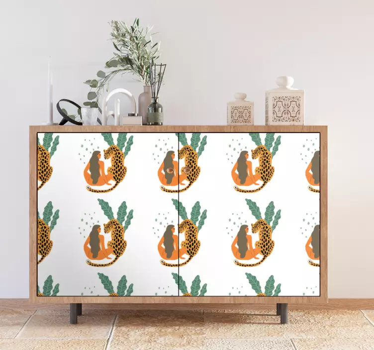 Transform your living space with the enchanting Furniture sticker leopard plant scene. This whimsical design captures a stunning hand-drawn motif featuring a couple surrounded by vibrant plants and playful leopards. The tropical essence of nature bursts forth, creating an inviting atmosphere that adds character and charm to any furniture piece!