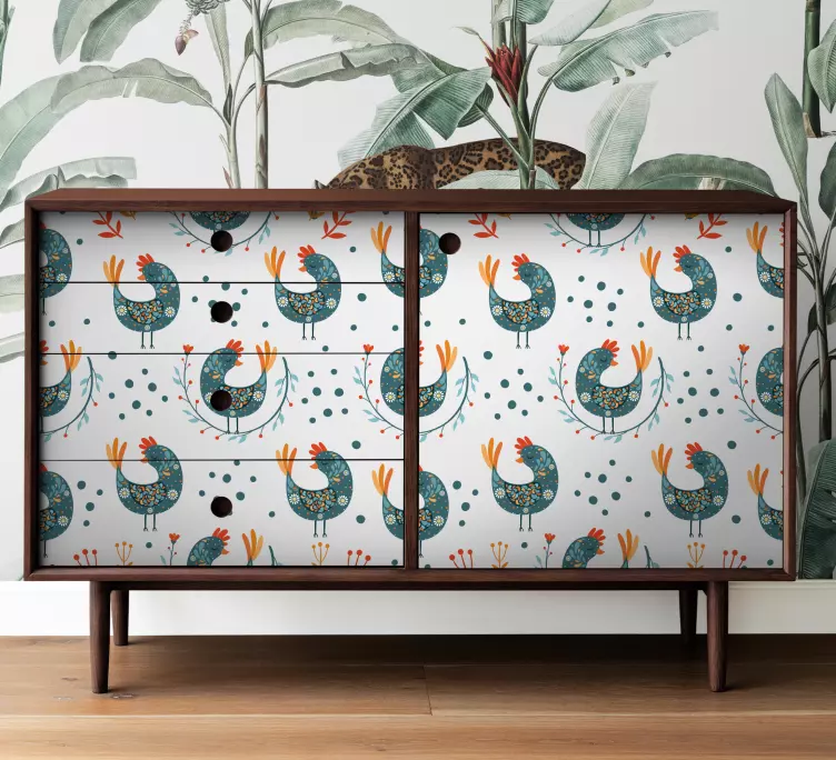 Introducing our Furniture sticker lively rooster design, a vibrant and playful addition to your home decor! This stunning design features delightful chickens and farm animals surrounded by a floral pattern, creating a colorful and joyful atmosphere. The lively illustrations are perfect for those who appreciate the beauty of nature and the charm of farm life. Transform your furniture into a stunning focal point with this unique and artistic design!