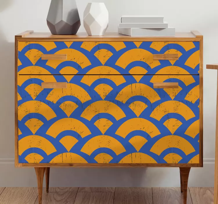 Transform your space with our stunning Furniture sticker wave pattern design, featuring a unique blend of geometric forms and a striking palette of blue and orange. This minimalist and abstract design showcases elegant bows that gracefully weave through the pattern, creating a visual delight that adds a modern touch to any furniture piece.