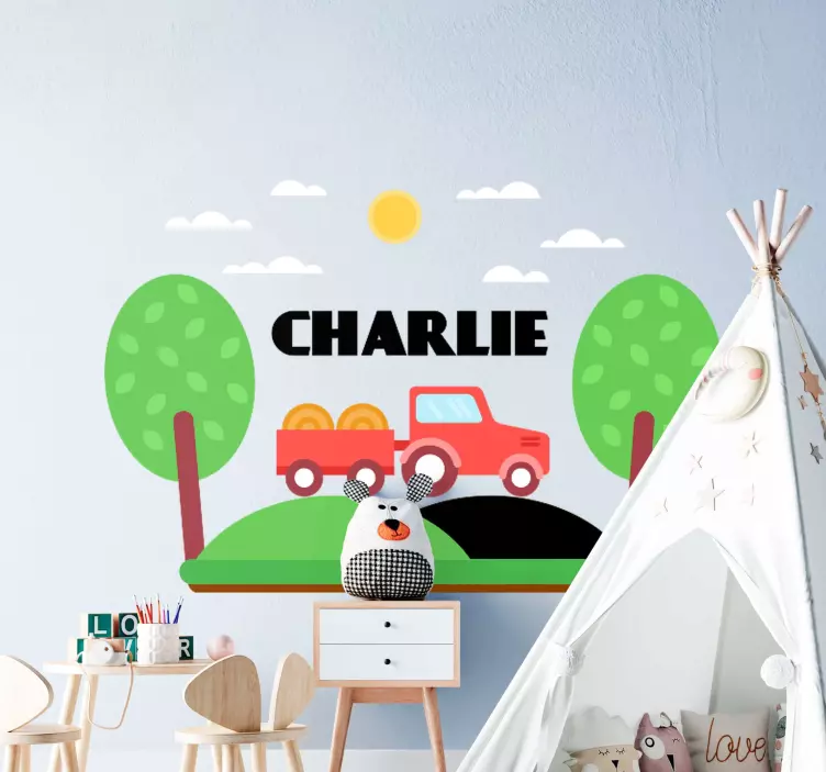 Transform your child's space with our vibrant Kid's sticker custom truck scene! This delightful design features a charming tractor, a bustling farm, and a customizable truck set against a backdrop of lush trees and greenery. Perfect for little ones who love nature, this playful scene is sure to brighten any room with the cheerful sun shining down on their imaginative adventures!