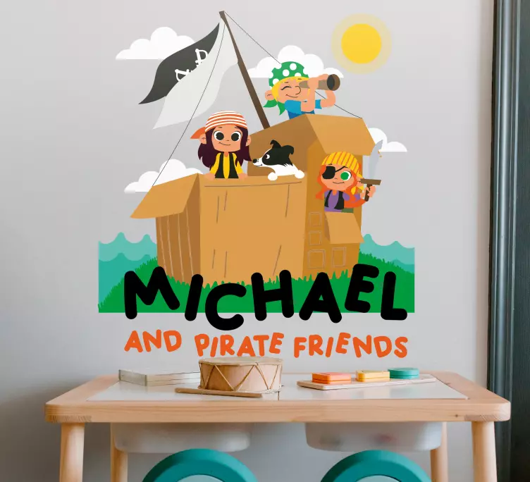 Reference: A48764A vibrant scene featuring children dressed as pirates aboard a cardboard ship, complete with a sail and a playful dog. The design captures the essence of childhood imagination and adventure, perfect for creating a fun atmosphere in a child's space.