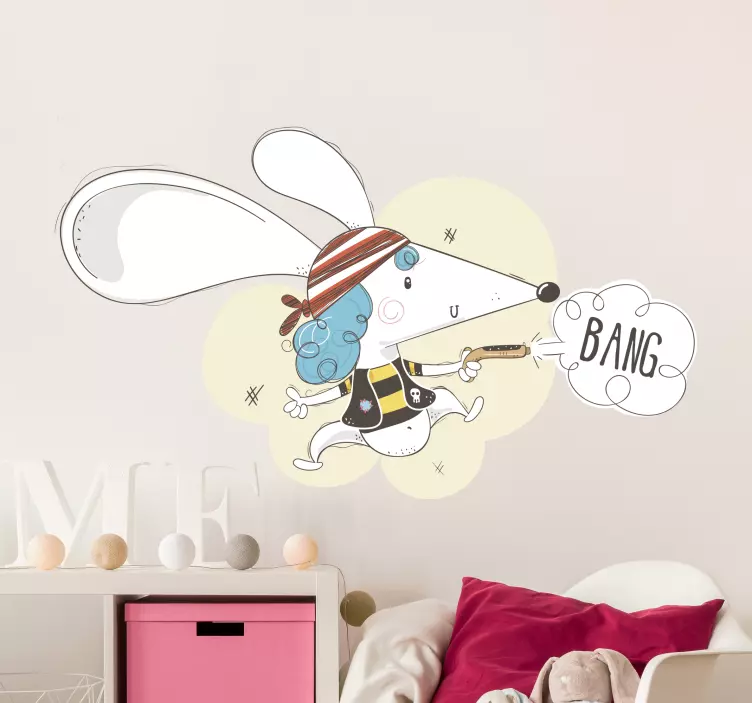 Reference: A47215A playful cartoon depiction of a mouse dressed as a pirate, complete with a striped hat and blue hair. The whimsical character holds a toy and exclaims 'BANG', adding a sense of fun and adventure, perfect for children's spaces.
