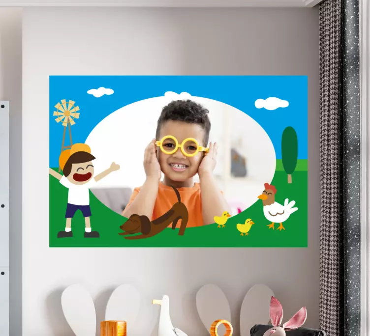 Transform your child's space with our Kid's sticker playful farm scene, a delightful design featuring whimsical cartoon animals set against a vibrant farm backdrop. This colorful masterpiece is perfect for igniting your child's imagination, turning their room into a fun-filled sanctuary that reflects their playful spirit. With a charming frame and the ability to customize photos, it’s an eye-catching addition that every child will love!