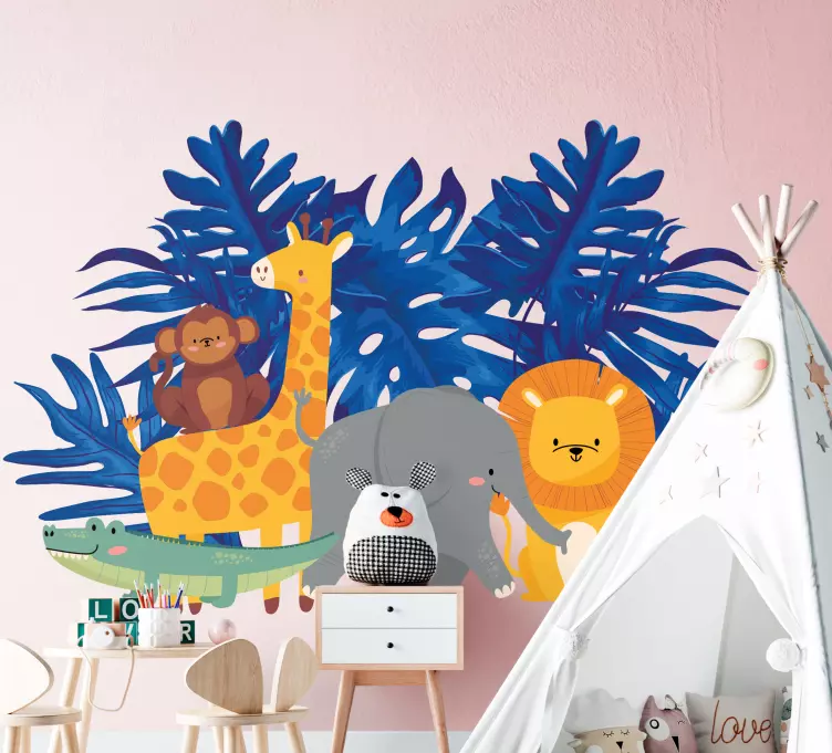 Transform your child's space into a vibrant adventure with our Kid's sticker playful jungle animals. This delightful design features an array of cute jungle creatures like a monkey, giraffe, elephant, lion, and crocodile, surrounded by lush leaves and colorful elements that create a fun and wild atmosphere perfect for children. Each sticker is designed to inspire creativity and joy in any room!