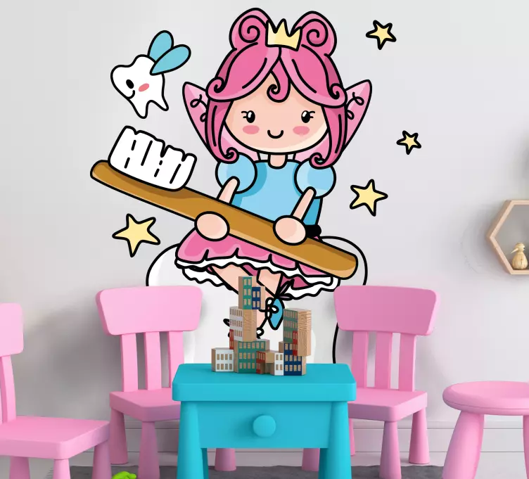 Reference: A48806A charming depiction of a tooth fairy character, complete with a toothbrush and a playful expression. This design adds a magical touch to any children's space, encouraging fun dental habits while capturing the imagination with its colorful and cheerful elements.