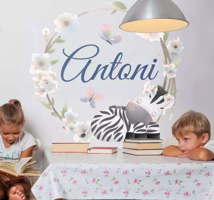 Introducing our delightful Kid's sticker zebra floral design! This enchanting design features a playful zebra surrounded by a beautiful wreath of flowers, perfect for adding a touch of whimsy to any child's space. With customizable options, you can personalize it with a name in charming calligraphy, making it a unique piece that embodies the spirit of fun and creativity. The combination of cute animals and vibrant floral elements creates an inviting atmosphere that children will adore!