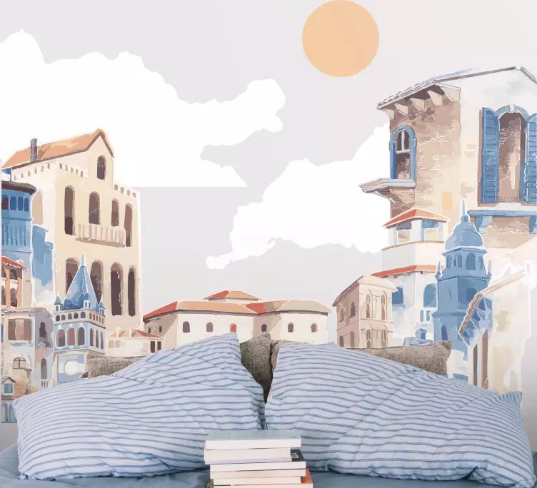 Discover our Location sticker charming cityscape, a stunning design that captures the essence of a vibrant town with its charming village buildings, beautifully illustrated in watercolor. The warm tones of blue and the radiant sun beautifully illuminate this cityscape, creating a piece that not only enhances your space but also warms the heart!