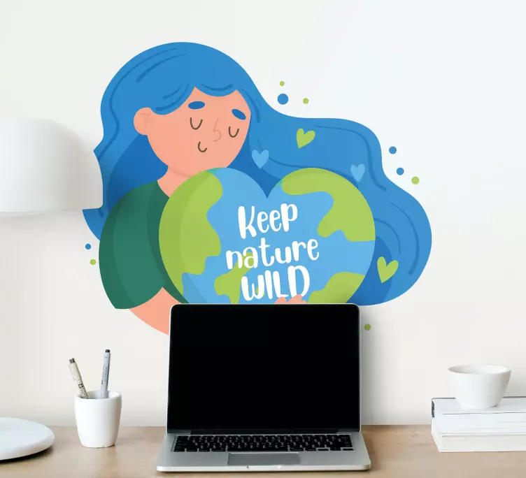 Reference: A48040A representation emphasizing the importance of caring for our planet, framed by a character tenderly holding a heart-shaped globe. The phrase encourages a commitment to preserving the wild aspects of nature, highlighting love and connection with the earth.