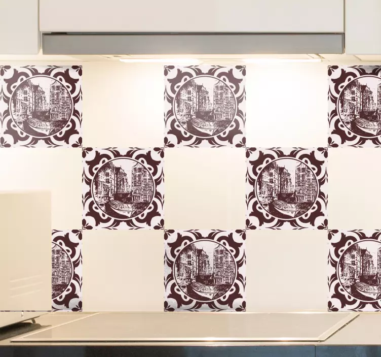 Our Location sticker historic canal view is a stunning representation of European architecture, featuring charming houses, a serene canal, and intricate tile patterns that beautifully capture the essence of a vibrant cityscape. This decorative piece is designed to transform any space into a picturesque scene, inviting warmth and elegance into your home!