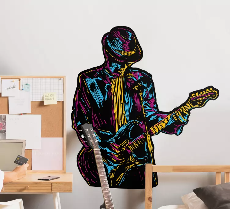 The Musical stickers colorful guitarist silhouette features a vibrant and eye-catching design that showcases a man in a playful doodle style, striking a pose with his electric guitar. This lively silhouette encapsulates the essence of a passionate musician, celebrating the art of performance and the joy of music. The array of colors adds a fun and dynamic touch, making it a perfect choice for any music lover's space!