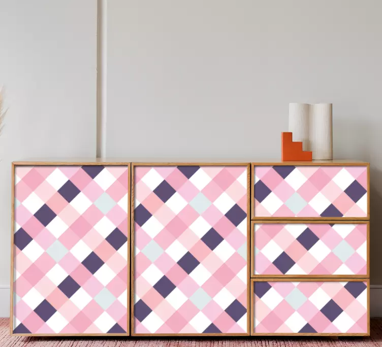 The Object sticker pink patterned surface features a vibrant, checkered design that beautifully combines geometric shapes and colorful textures, making it an ideal choice for modern home decor. This eye-catching pattern is perfect for enhancing furniture and drawers, adding a touch of personality to any space with its playful yet sophisticated look!