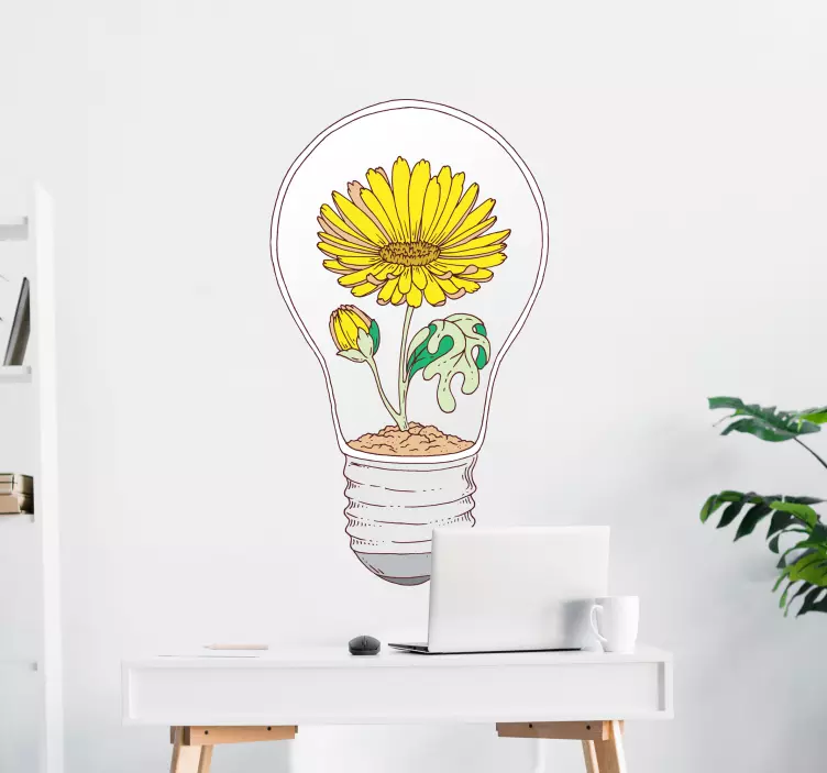 Transform your space with the enchanting Wall sticker blooming light bulb. This captivating design features a brilliant light bulb blooming with vibrant sunflowers, lush leaves, and delicate flowers, symbolizing nature's growth and vitality. The imaginative illustration in a warm yellow hue brings a fresh and joyful atmosphere to any room, making it a perfect choice for those who appreciate the beauty of nature.