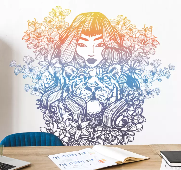Introducing our stunning Wall sticker woman with tiger! This unique design beautifully combines a woman and a majestic tiger in a captivating line art drawing, surrounded by vibrant flowers and floral elements. The gradient colors and bold colors create a mesmerizing effect that will instantly elevate any space!