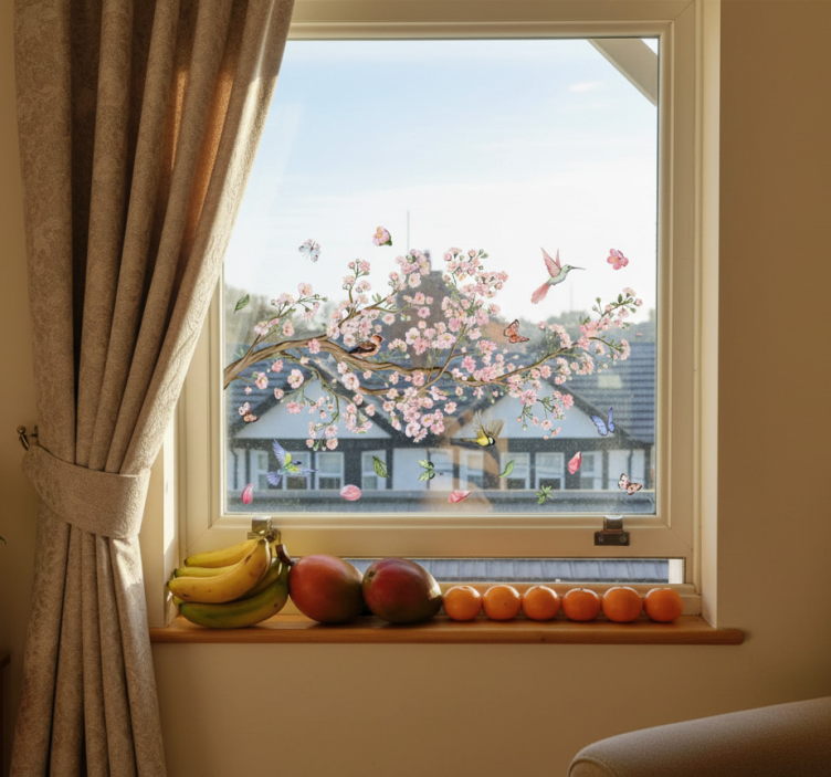 Reference: A53277Transform your space with our stunning Window sticker cherry blossom with birds. This beautifully designed sticker features delicate cherry blossoms and graceful birds, creating a serene and uplifting atmosphere. The satin finish ensures vibrant colors without glare, making it perfect for any window or flat surface. Enjoy long-lasting beauty with its impressive durability of 8-10 years while easily maintaining it with a damp cloth and mild soap!