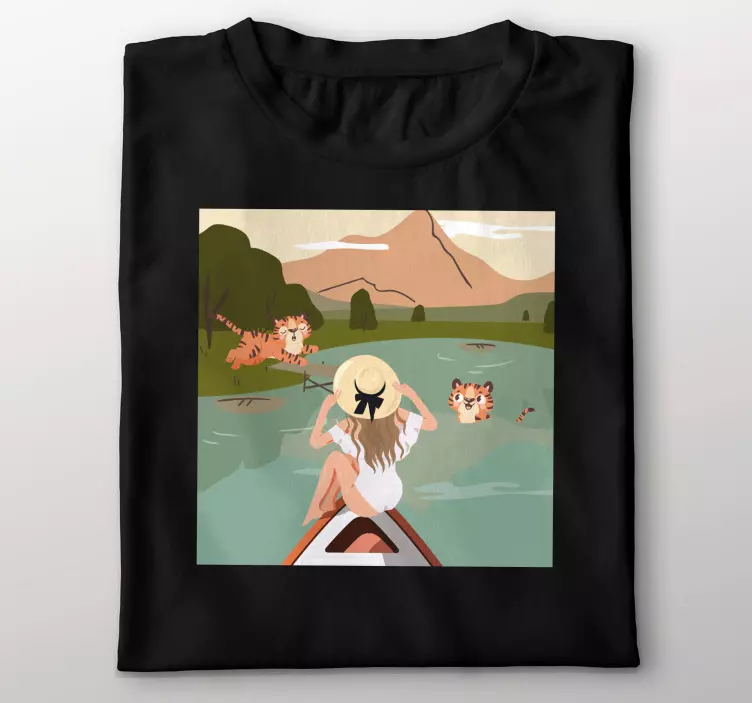Step into the wild with our Adventure with tigers t-shirt, featuring a vibrant and playful illustration of a girl surrounded by majestic tigers. This eye-catching design captures the essence of nature, showcasing a serene lake with lush greenery, while the cartoonish style adds a fun twist. Perfect for outdoor enthusiasts, this shirt embodies relaxation and adventure, making it a must-have for any wardrobe!