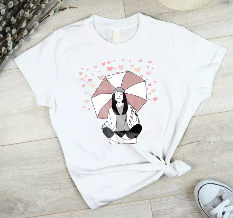 Introducing our Charming heart pattern t-shirt, a delightful piece of apparel that features a whimsical design perfect for any casual outing. This enchanting t-shirt showcases a cheerful girl under a colorful umbrella, surrounded by playful hearts that exude love and joy. With its charming cartoon illustration, this cute and smiling character embodies a sense of carefree happiness, making it an ideal choice for those rainy days when you want to stay comfortable and stylish.
