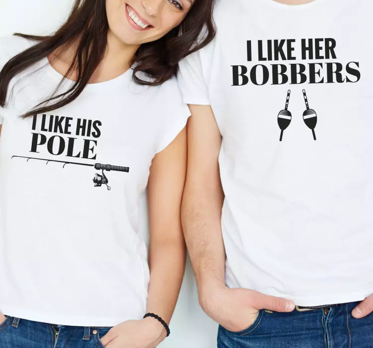 Reference: T5280This image showcases a couple wearing playful shirts featuring humorous fishing-related quotes. Each shirt highlights witty phrases, combining fun and charm, perfect for couples who enjoy fishing together. The design embraces a lighthearted theme that is sure to amuse both wearers and onlookers.