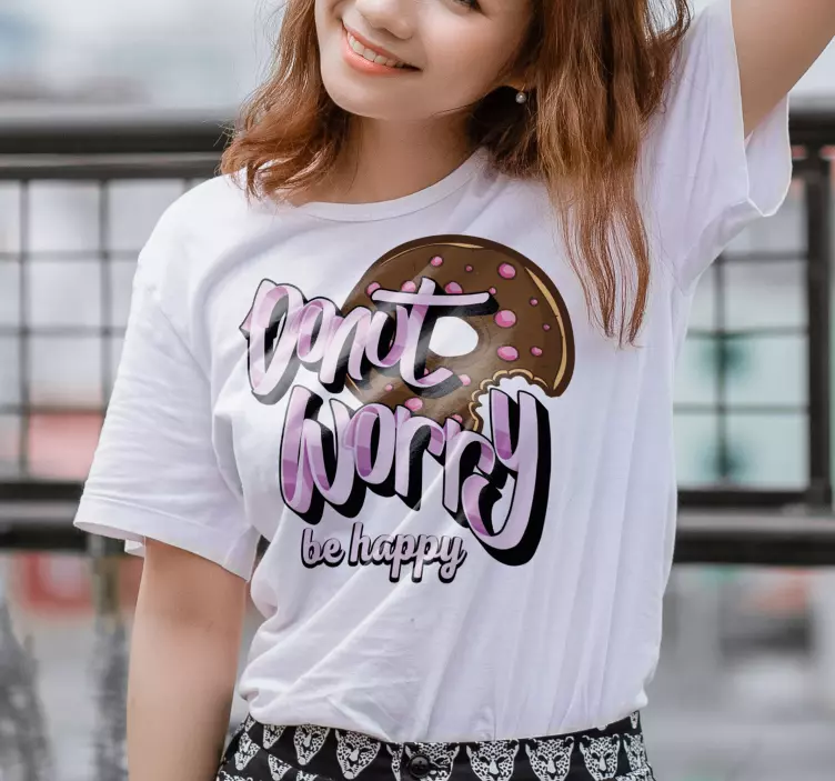 Introducing our Don't worry be happy t-shirt, a delightful blend of humor and positivity! This unique design features a whimsical donut illustration paired with clever wordplay that encapsulates the essence of joy and celebration. The text radiates a vibrant message of happiness, making it a perfect choice for casual outings or a fun day with friends. With its positive and funny vibes, this t-shirt is not just a piece of clothing; it’s a statement of carefree fashion!