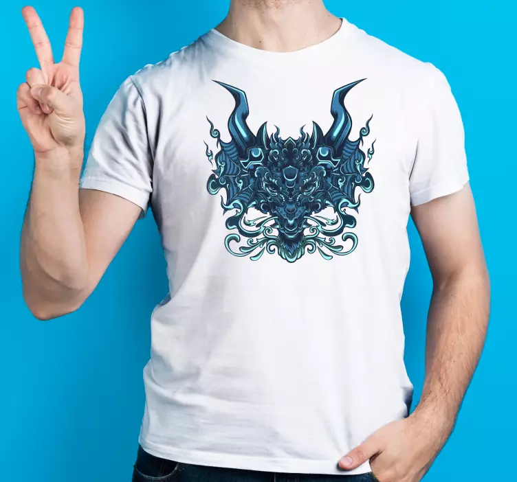 Introducing the Fierce horned creature t-shirt, a stunning graphic masterpiece that features a mesmerizing dragon design. This mythical and scary creature, with its bold blue tones and iconic horns, embodies an artistic interpretation of horror and evil. Perfect for those who appreciate the darker side of artistry, this t-shirt will make you stand out in any crowd!