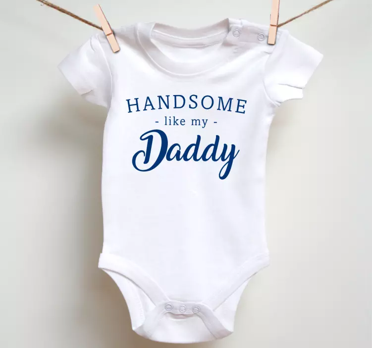 Reference: T5450This charming outfit features the phrase 'Handsome Like Daddy', perfect for celebrating the bond between fathers and their little ones. The design combines playful typography with a classic look, making it a delightful choice for any occasion.