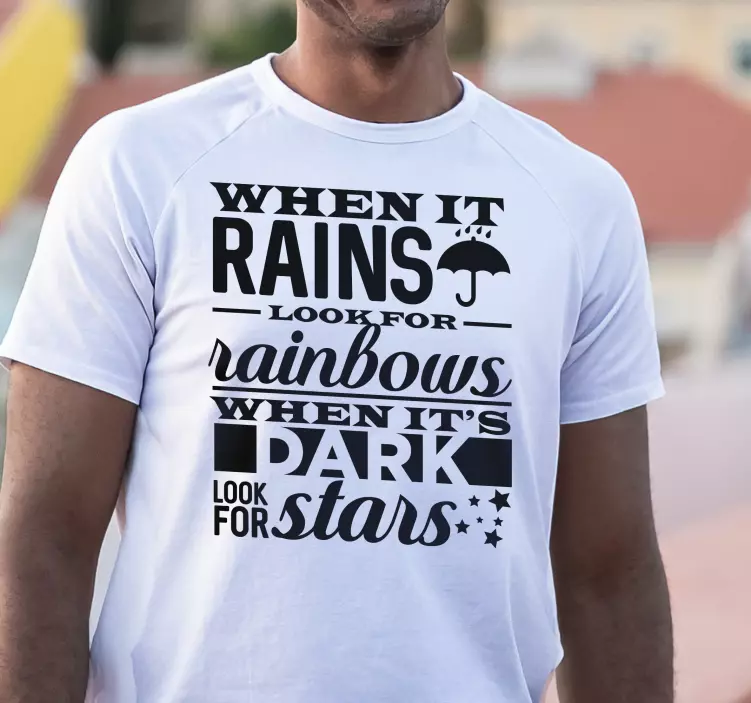 Introducing our Inspiring positive outlook t-shirt, a beautifully designed piece that captures the essence of hope and positivity! Featuring delightful elements like rain, a stunning rainbow, and twinkling stars, this shirt also showcases an uplifting quote that promotes positive thinking and inspiration. The thoughtful phrase printed on this t-shirt is a daily reminder to embrace life with a cheerful heart!