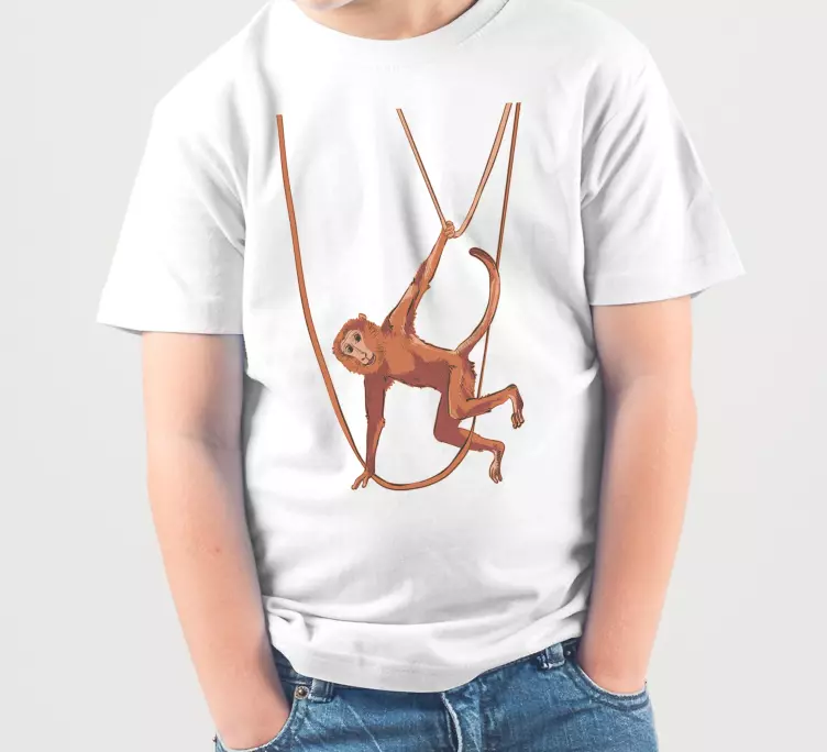 The Kids t-shirt monkey swinging on a rope features a delightful illustration of a playful monkey swinging through nature. This vibrant design captures the essence of fun and adventure, making it a perfect addition to any child's wardrobe. With its charming depiction of an ape in motion, this t-shirt is sure to bring smiles and joy to your little ones, encouraging their playful spirit!