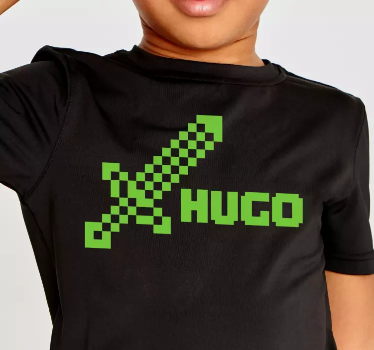 Reference: T4921This vibrant piece features a pixelated sword design alongside a customizable name. The bold green against a sleek black background creates a striking visual appeal, perfect for young gaming enthusiasts. It's a fun, personalized addition to any child's wardrobe.