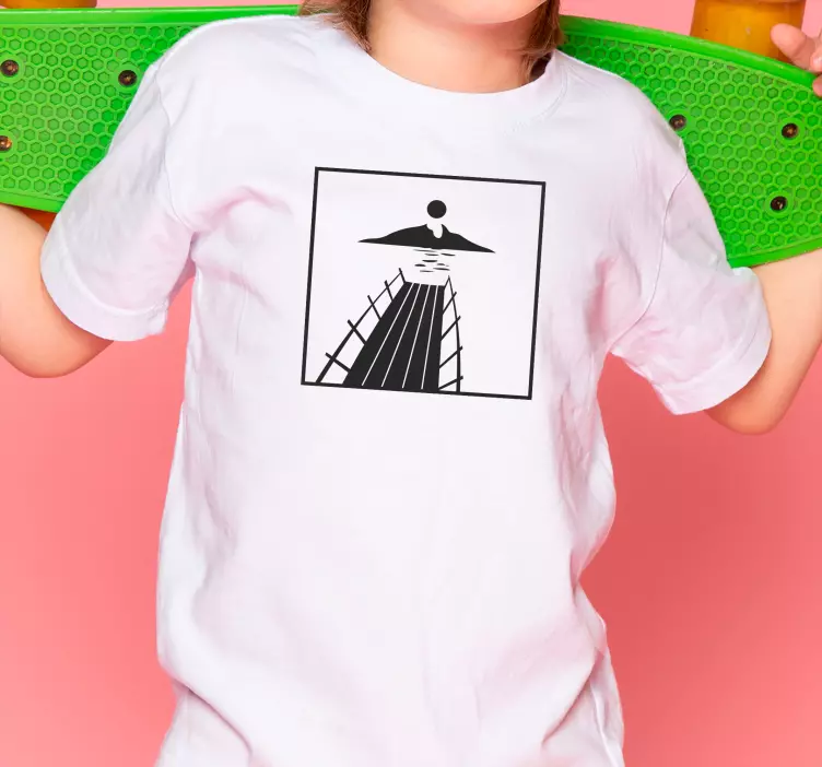 Reference: T4688This design features a serene sunset over a dock, highlighting a child with a skateboard. The imagery conveys a sense of adventure and outdoor fun, perfect for kids. Simple lines and shapes create a bold contrast, making it visually appealing for young ones.