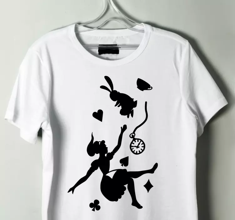 Introducing our delightful Kids t-shirt whimsical tea party fun! This enchanting design features a whimsical tea party scene inspired by the classic tale of Alice in Wonderland. With charming rabbit silhouettes, a falling character, and a whimsical pocket watch adorned with hearts, this t-shirt captures the magic of adventure and imagination. Your little one will love wearing this imaginative piece that brings the spirit of the story to life!